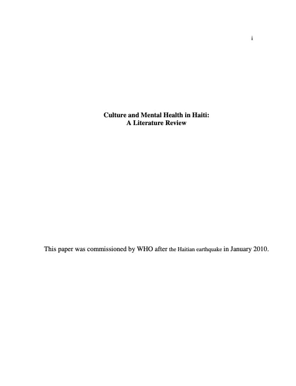 The first part of the review describes historical, economic, sociological and anthropological factors essential to a basic understanding of Haiti and its people. This includes discussion of demography, family structure, Haitian economics and religion. The second part of the review focuses on mental health and mental health services. This includes a review of factors such as basic epidemiology of mental illness, common beliefs about mental illness, explanatory models, idioms of distress, help-seeking behavior, configuration of mental health services and the relationship between religion and mental health.